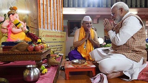 नवी दिल्ली - गणपती बाप्पा मोरया....मंगलमूर्ती मोरया....अशा जयघोष आज सगळीकडे ऐकायला मिळत आहे. दरम्यान, पंतप्रधान नरेंद्र मोदी (Narendra Modi)यांनी देखील देशवासियांना गणेशोत्सवाच्या शुभेच्छा दिल्या आहेत. मोदी यांनी त्यांच्या अधिकृत ट्वीटर अकाऊंट वर गणरायचा फोटो शेअर करत देशवासीयांना गणेशोत्सवाच्या शुभेच्छा दिल्या आहेत. एक श्लोक शेअर करत गणरायाची कृपा कायम राहो यासाठी प्रार्थना केली आहे.