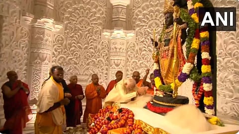 अयोध्येतील भव्य राम मंदिराचे आज मोठ्या थाटामाटात लोकार्पण करण्यात आले. पंतप्रधान नरेंद्र मोदी यांच्या हस्ते प्रभू श्रीरामांच्या मूर्तीची प्राणप्रतिष्ठा करण्यात आली. दुपारी १२ वाजून २९ मिनिटांनी हा लोकार्पण सोहळा पार पडला. यावेळी जय श्रीरामाच्या घोषणांनी अयोध्यानगरी दुमदुमून गेली होती. यावेळी राष्ट्रीय स्वयंसेवक संघाचे सरसंघचालक मोहन भागवत यांची देखील उपस्थिती होती. ('साम टीव्ही'चं व्हॉट्सअॅप चॅनल जॉईन करण्यासाठी येथे क्लिक करा)