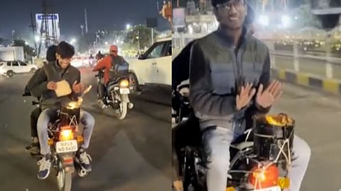 व्हायरल होतं असलेल्या एका व्हिडिओमध्ये दोन तरुण दुचाकीवरून चालले आहेत. प्रवास करत असताना दोघांनी देखील अंगावर स्वेटर घातलेलं दिसत आहे. मात्र थंडी थोडी जास्तच आहे भावा असं म्हणत यातील मागे बसलेल्या तरुणाने चक्क दुचाकीवर आग लावली आहे. म्हणजे हा तरुण दुचाकीवर उलट्या दिशेने बसला आहे आणि मागे पकडण्याच्या हॅण्डलला त्याने एक शेकोटी बनवली आहे. या शेकोटिवर तो मस्त थंडीपासून स्वतःला वाचवत आहे.