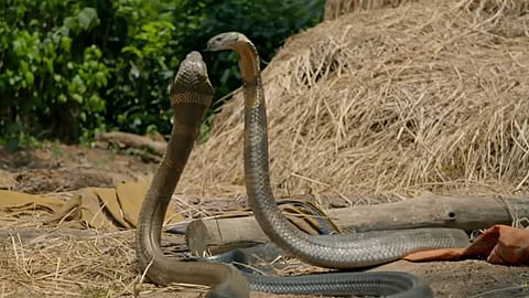 Viral Video: प्रेमात कोणत्याही व्यक्तीला आपल्या प्रियकराकडे दुसऱ्या व्यक्तीने चुकीच्या नजरेने पाहिलेलं आवडतं नाही. अनेक मुलं मुली कॉलेजमध्ये असतानाच एकमेकांच्या प्रेमात पडतात. अशात दोन मुलं एकाच मुलीच्या प्रेमात असतील तर मोठी हाणामारी निश्चित असते. असाच प्रकार प्राण्यांध्ये देखील असतो हे सांगणारा एक व्हिडिओ सध्या सोशल मीडियावर जोरदार व्हायरल होत आहे. ही प्रेम कहाणी कोणत्या साध्या प्राण्याची नाही तर चक्क किंग कोब्रा सापाची आहे. (Latest Viral Video)