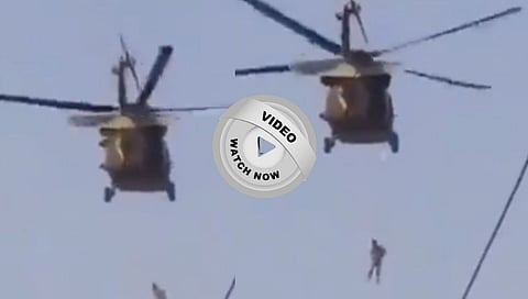 जो झेंडा फ़डकवण्याचा प्रयत्न करत आहे. मात्र, यामध्ये अपयशी ठरला आहे. व्हायरल व्हिडिओ मध्ये असे दिसत आहे की, या व्यक्तीला दोरीच्या मदतीने हेलिकॉप्टरला लटकवले आहे. मात्र, व्हिडिओ झूम करून बघितल्यास दिसते, की या व्यक्तीला बांधले गेले आहे. जेणेकरून तो झेंडा लावू शकणार आहे.
