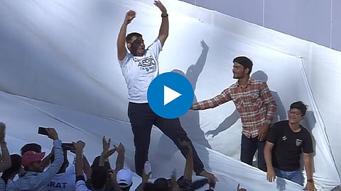 मात्र एका अतिउत्साही प्रेक्षकाने थेट साईड स्क्रीनवर उडी मारली आणि आत जाऊन चेंडू शोधून काढला. चेंडू शोधल्यानंतर तो भलताच खुश असल्याचे दिसून आले. हा व्हिडीओ सध्या सोशल मीडियावर जोरदार व्हायरल होत आहे.