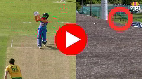 तर झाले असे की, भारतीय संघाची फलंदाजी सुरू असताना तिलक वर्मा स्ट्राईकवर होता. त्यावेळी गेराल्ड कोएत्जी पाचवे षटक टाकण्यासाठी गोलंदाजीला आला होता. या षटकातील पाचव्या चेंडूवर तिलक वर्माने लेग साईडच्या दिशेने गगनचुंबी षटकार मारला. हा चेंडू थेट मैदानाबाहेर जाऊन पडला. हा व्हिडिओ सोशल मीडियावर तुफान व्हायरल होतोय.