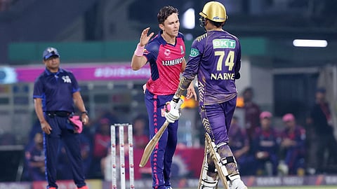 Kolkata Knight Riders vs Rajasthan Royals : आयपीएलच्या पॉइंट्स टेबलवर अव्वल स्थान पटकावण्यासाठी इडन गार्डनवर आज केकेआर आणि आरआरचा संघ आमनेसामने आलेत. आपल्या घरच्या मैदानात फलंदाजी करताना कोलकाता नाइट रायडर्सच्या खेळाडूंनी धावांचा वर्षाव केला. सुनील नारायणने वादळी खेळी करत राजस्थान रॉयल्सच्या सर्व प्लानवर पाणी फेरलं. सुनील नारायणने अवघ्या ४९ चेंडू शतक ठोकत राजस्थानच्या संघासमोर २२४ धावांचे आव्हान ठेवलं.