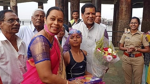 रायगड : रायगडची (raigad) जलकन्या म्हणून ओळखल्या जाणाऱ्या रुद्राक्षी टेमकर (rudrakshi temkar) या अवघ्या ११ वर्षीय मुलीने आज (साेमवार) धरमतर ते मांडवा (Dharamtar to Mandwa) हे २६ किलाेमीटरचे अंतर अवघ्या ५ तास ५४ मिनिटांत पाेहून (swimming) पूर्ण करून विक्रमाला गवसणी घालण्याचा प्रयत्न केला आहे. शिवजयंतीदिनी रुद्राक्षीने अनाेखा उपक्रम करुन (chhatrapati shivaji maharaj) छत्रपती शिवाजी महाराज यांना अभिवादन केले. (rudrakshi temkar latest marathi news)