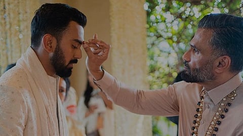 या फोटोमध्ये सुनील शेट्टी केएल राहुलला माथ्याला टिळा लावताना दिसून येत आहेत. हा फोटो केएल राहुल आणि अथिया शेट्टी यांच्या विवाह सोहळ्यातील असल्याचे दिसून येत आहे. या फोटोमध्ये केएल राहुलने शेरवानी परिधान केली आहे. (KL Rahul Birthday)