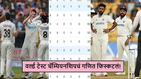 बंगळूरू टेस्टमध्ये टीम इंडियाचा पराभव जवळपास निश्चित मानला जात होता. या सामन्यामध्ये न्यूझीलंडने टीम इंडियाचा ८ विकेट्सने पराभव केला आहे. या विजयासह न्यूझीलंडच्या टीमने ३ सामन्यांच्या टेस्ट सिरीजमध्ये १-० अशी आगाडी घेतली आहे. तर दुसरीकडे वर्ल्ड टेस्ट चॅम्पयनशिपच्या पॉईंट्स टेबलमध्ये टीम इंडियाचं नुकसान झालं आहे. याचसोबत वर्ल्ड टेस्ट चॅम्पियनशिपची फायनल गाठण्याचं टीम इंडियाचं गणित देखील फिस्कटलं आहे.