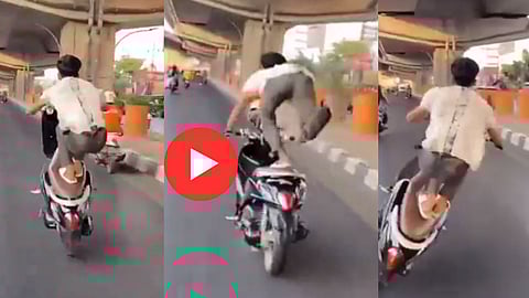 या व्हिडिओमध्ये तुम्ही पाहू शकता की, एक तरुण त्याची भरधाव स्कूटी पळवताना दिसत आहे. रस्त्यावर वाहनांची वर्दळ असतानाच तो गाडीचा समोरील टायर उचलून फक्त पाठीमागच्या चाकांवर गाडी पळवतोय. अचानक गाडीवरील ताबा सुटतो आणि गाडी जोरात पडते. रस्त्याच्या कठड्यावर आदळून गाडी रस्त्यावर घसरत जाते.