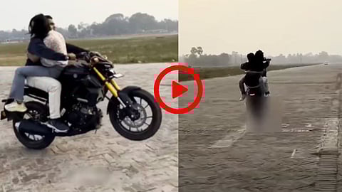 व्हायरल होत असलेल्या व्हिडिओत,सुरुवातीस एक तरुण स्पोर्ट्स बाईक चालवत असतो,मात्र त्यानंतर तो त्या स्पोर्ट्स बाईक एका तरुणीला बसवतो पण तरुणीला तो चक्क पेट्रोलची टाकी अर्थात त्याच्या समोर बसवतो.मग काय व्हिडिओत पुढे पाहिले तर दिसते की,तो धावत्या बाईकचे टायर वर करत धोकादायक स्टंटबाजी(Stunt) करताना दिसत आहे.संपूर्ण परिसरातील नागरिक ही धोकादायक स्टंटबाजी पाहत आहेत.