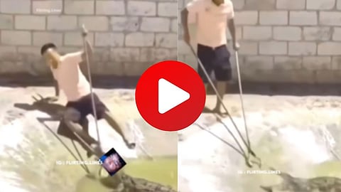 व्हिडीओमध्ये तुम्ही पाहू शकता की, हा व्यक्ती आपल्या हातामध्ये एक पक्कड घेऊन उभा आहे. समोर एका तवातात थोडं पाणी आणि एक मगर आहे. या मगरीला हा तरुण पकडण्याचा प्रयत्न करत आहे. मगर पकडण्यासाठी त्याच्याकडे असलेली लांब पक्कड तो पुढे सरकवतो. त्यामुळे मगर आपला जीव वाचवण्यासाठी समोरच्या व्यक्तीवर हल्ला करण्याचा प्रयत्न करते.