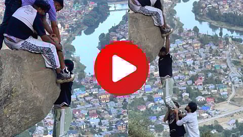 व्हिडीओमध्ये तीन मुलं उंच दगडावर उभे आहेत. त्यानंतर त्यांनी आपल्या मित्राला खाली लटकवलंय. त्याचे हात त्यांनी धरून ठेवलेत. हा तरुण खाली उतरत आहे की, वरती येत आहे? असा प्रश्न व्हिडीओ पाहताना पडतोय. तर या तरुणाचे अन्य दोन मित्र खाली उभे आहेत. व्हिडीओ पाहताना सुरूवातीला ही खोल दरी असावी असं वाटतं. मात्र प्रत्यक्षात तसं काहीच नाही.