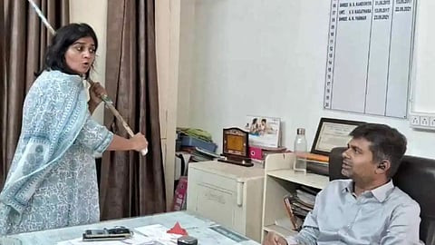 Gujarat Jamnagar : गुजरातच्या जामनगरमधून एक व्हिडिओ सोशल मीडियावर व्हायरल होत आहे. या व्हिडिओमध्ये एक महिला थेट वीज वितरण विभागाच्या कार्यालयात काठी घेऊन पोहोचली. काठी हातात असलेली महिला वीज वितरण विभागाच्या अधिकाऱ्यांवरच खेकसली. महिलेने कार्यालयातील अधिकाऱ्यांना थेट मारहाणीची धमकी दिली. या व्हिडिओमध्ये ही महिला नगरसेविका आहे. महिला नगरसेविकाच्या संतापाचा व्हिडिओ सोशल मीडियावर व्हायरल होत आहे.