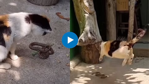 मांजराला पाहून साप (Snake) पळून जाण्याचा प्रयत्न करतो. मात्र, मांजर काही या सापाला सोडत नाही. साप पुढे जात असताना मांजर त्याची शेपूट खेचते. यावेळी साप सुद्धा मांजरावर हल्ला करतो. मात्र, त्याच्या हल्ल्यातून मांजर स्वत:चा बचाव करते आणि लगेच मागे हटते.