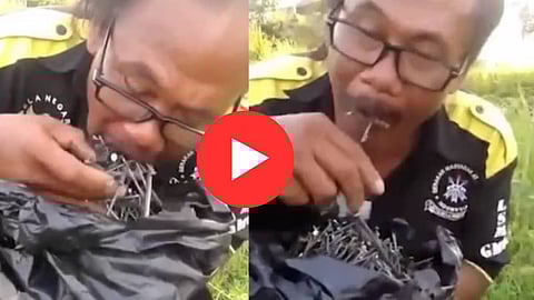 सोशल मीडिया (Social Media) म्हणजे असंख्य व्हिडिओंचा खजिना. सोशल मीडियावर अनेकदा असे काही व्हिडिओ पाहायला मिळतात, जे पाहून नेटकरीही चक्रावून जातात. सध्या अशाच एका व्हायरल व्हिडिओने नेटकऱ्यांचे लक्ष वेधले आहे. या व्हायरल व्हिडिओमध्ये एक व्यक्ती चक्क मुठ भरुन खिळे खाताना दिसत आहे.