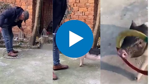 व्हायरल होत असलेल्या व्हिडिओत आपल्याला दिसते की, व्हिडिओतील व्यक्ती एक रिंग घेऊन ती कंबरेतून फिरवण्याचा प्रयत्न करत आहे. मात्र वारंवार प्रयत्न करुनही तो रिंग योग्यरित्या फिरवण्यात अयशस्वी ठरत आहे. या व्यक्तीच्यासमोर एक लहान डुक्कर आहे. डुक्कर या व्यक्तीला रिंग फिरवताना बघत असतो. मात्र व्यक्तीला रिंग फिरवण्यास नजमल्याचे बघून तो डुक्कर तिथून निघून जातो आणि एक लहान रिंग घेऊन येतो त्यानंतर तो आपल्या नाकाच्या साहाय्याने ती रिंग उत्तमरित्या फिरवतो. हा व्हिडिओतील डुक्कराला रिंग फिरवताना पाहून नेटकरी आश्चर्यचकीत झाले असतीलच.