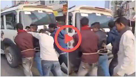 एका गंभीर गुन्ह्यात अटक केलेल्या चार आरोपींना घेऊन पोलीस विभागाचे वाहन कोर्टाकडे निघाले होते. यावेळी अचानक कचहारी चौकाजवळ स्कार्पिओ बंद पडली. त्यामुळे कारमधील कैद्यांना पोलिसांनी बाहेर काढले आणि कार ला धक्का देऊन रस्त्यातील कार बाजूला केली. यावेळी कैद्यांचे हात दोरीने बांधल्याचं व्हिडिओत दिसत आहे. एक पोलीस कर्मचारी कार चालवत आहे तर दुसरा कारला धक्का देणाऱ्या कैद्यांवर नजर ठेवताना दिसत आहे. कैद्यांनी वाहन 500 मीटरपेक्षा जास्त ढकलल्याची माहिती आहे. फस्ट बिहार झारखंड