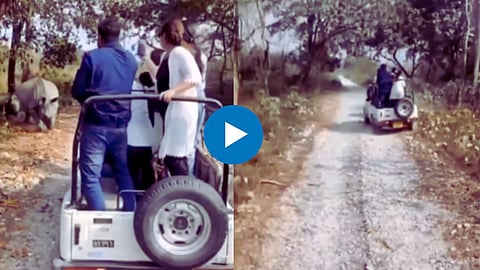 व्हायरल(Viral) होत असलेल्या व्हिडिओत तुम्ही पाहू शकता, पर्यटकांनी भरलेली एक जीप आहे जी जंगलातून फिरत आहे आणि विविध प्राणी पाहत आहेत. जंगलातून जात असताना पर्यटकांनी भरलेल्या जीप समोर अचानक वेगात एक गेंडा येतो आणि जीपच्या दिशेने जात असतो. धावत येत्या गेंड्याला पाहून जीप चालकाने ती जिपच उलट्या दिशेने चालवण्यास सुरुवात करतो. जीपच्या पाठी मागे आपल्याला वन विभागाचा एक कर्मचारी स्कुटीवर आहे तो ही पळताना दिसत आहे, मात्र उलट्या दिशेने जीप येताना ती रस्त्याच्या कडेला कलंडली जाते आणि सर्व प्रवासीही त्यामधून पडतात. सर्व घटना पाठीमागे असलेल्या एका पर्यटकाने मोबाईलमध्ये कैद केलेली आहे.