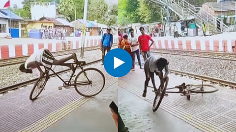Railway Station Video: सोशल मीडियावर सध्या एका व्यक्तीचा हैराण करणारा व्हिडिओ व्हायरल होत आहे. ज्यात रेल्वे प्लॅटफॉर्मवर व्यक्तीने सायकल चालवत विविध स्टंट केले आहे. भर गर्दीच्या वेळी स्टंट केल्याने प्लॅटफॉर्मवर प्रवाशांची मोठी गर्दी जमली होती मात्र व्हिडिओ व्हायरल झाल्यानंतर नेटकऱ्यांनी या व्यक्तीवर मोठ्या प्रमाणात संताप व्यक्त केला आहे.