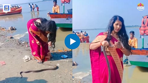 व्हायरल(Viral) होत असलेल्या व्हिडिओत तुम्हाला एक महिला नदीच्या काठावर पूजा करताना दिसतेय.मात्र ती पूजा करत असताना तिच्या बाजूला भलामोठा साप असतो,मात्र महिला सापाला न घाबरता त्याच्या पाया पडते आणि त्या सापाला हाताने उचलून थेट स्वत:च्या गळ्यात गुडांळते.संपूर्ण धक्कादायक प्रकार एका व्यक्तीने मोबाईलमध्ये कैद केलेला आहे.
