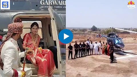 धाराशिवच्या भूम तालुक्यातील अंतरवली गावातील शेतकरी भास्कर शिकेतोड या शेतकऱ्यांनी मुलाच्या लग्नासाठी(Weeding) गावात थेट हेलीकाॅप्टरच आणला. शिकेतोड यांचा मुलगा आकाश आणि अस्मीता या दोघांचा विवाह काल पार पडला लग्नात नवरदेवाची मिरवणूक थेट हेलीकॉप्टरने काढण्यात आली.