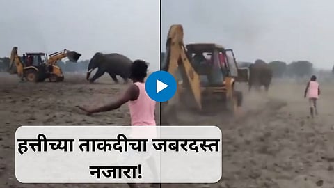 व्हायरल होत असलेल्या व्हिडिओत तुम्हाला एक भली मोठी मोकळी जागा दिसत आहे.व्हिडिओत दिसत असलेल्या मोकळ्या मैदानात एक जेसीपी आणि काही व्यक्ती आहेत.अशातच त्या मैदानात एक रुद्रावतार हत्ती(Elephant) येतो आणि समोर असलेल्या जेसीपीला पलटी मारतो.मात्र त्यानंतर हत्ती तेथून पळत जाताना दिसत असून हत्तीच्या पाठून जेसीपी आणि ते व्यक्ती पळत जाताना दिसत आहे.सर्व व्हिडिओ तेथील एका व्यक्तीने मोबाईलमध्ये कैद केलेला आहे.
