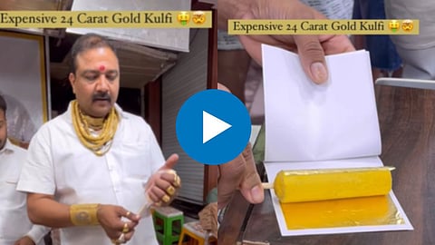 सोन्याची आईस्क्रीम खायची असेल तर यासाठी तुम्हाला 401 रुपये मोजावे लागणार आहेत. व्हिडीओमध्ये तुम्ही पाहू शकता की, आईस्क्रीम विक्रेत्या व्यक्तीने अंगावर देखील विविध सोन्याचे दागिने परिधान केले आहेत. दोन्ही हातात मोठे ब्रेसलेट, सोन्याच्या अंगठ्या, गाळ्यात 7 ते 8 जाड सोन्याच्या चैनी या व्यक्तीने परिधान केल्या आहेत.
