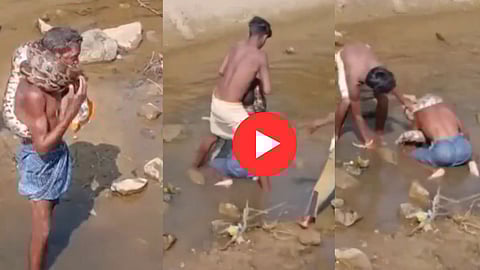 इंस्टाग्रामवर (Instagram) शेअर करण्यात आलेल्या या व्हिडिओमध्ये (Video) तुम्ही पाहू शकता की, एका कोरड्या कालव्यात वृद्ध व्यक्तीच्या मानेला महाकाय अजगराने विळखा घातला आहे. त्या वृद्धासह दोन तरुण सापाला सोडवण्याचा प्रयत्न करत आहेत. मात्र सापाचा विखळा इतका मजबूत आहे की वृद्धाला श्वास घेण्यासही त्रास होत आहे.