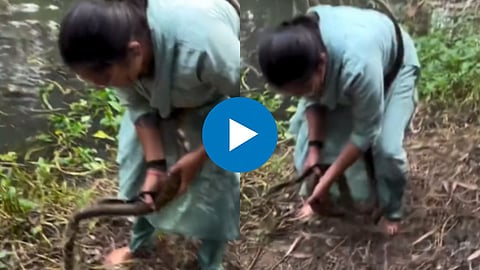 व्हायरल (Viral) होत असलेल्या एक तरुणी दिसून येत आहे. जी एका पाण्याचे लहानसे तळे असलेल्या ठिकाणी आहे. काही वेळात तिच्या हातात ती त्या तळ्यातील पाण्यातून एक साप हातात घेऊन येताना दिसते. मात्र व्हिडिओत तुम्ही नीट पाहिले तर दिसेल की,हातात असलेला साप लहानगा नसून चक्क भला मोठा किंग कोब्रा आहे. तरुणीच्या दुसऱ्या हातात एक कैची आहे. काही वेळात व्हिडिओत पुढे दिसते की, तरुणी जो साप हातात घेऊन आली आहे, त्या सापाचे तोंड संपूर्ण एका जाळीत अडकलेले आहे. तरुणी कैच्चीच्या मदतीने जाळीत अडकलेल्या सापाला वाचवते. संपूर्ण व्हिडिओ (Video) तिथे असलेल्या व्यक्तीने कॅमेऱ्यात कैद केला आहे.