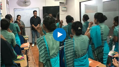 संपूर्ण देशभरात सोशल मिडिया पाहण्याचं खूप वेड आहे. सोशल मिडिया पाहण्यात सर्व नागरिक खूप रमलेले आहेत. अनेकदा सोशल मिडियावर खूप व्हिडिओ व्हायरल होत असतात. त्याचबरोबर अनेकांना सोशल मिडियावर फेमस सुध्दा व्हायचं असतं. त्यासाठी नागरिक वेगवेगळ्या युक्त्या शोधून काढत असतात. आपल्याला नेहमीच सोशल मिडियावर कधी डान्स, कधी गाण्याचे तर कधी स्टंट करणारे व्हिडिओ पाहायला मिळत असतात. पण त्यातील काही व्हिडिओ इतके व्हायरल होतात की त्यांची तुफान चर्चा होत असते. असाच एक व्हिडिओ सोशल मिडियावर खूप व्हायरल झाला आहे. त्यामध्ये नर्सरीच्या शिक्षिका एका ट्रेनिंग दरम्यान 'ओ टमाटर बडे मजेदार' गाणं बोलत आहे.
