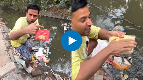 Man Viral Video: सोशल मीडियावर आपल्याला अनेक खाद्यप्रेमींचे व्हिडिओ पाहण्यासाठी मिळत असतात. खाद्यप्रेमी अनेक नवीन ठिकाणी जाऊन तेथील पदार्थांबाबत व्हिडिओतून सांगत असतात. मात्र अनेकदा काही खाद्यपदार्थांचे व्हिडिओ असे असतात की जे पाहून किळस येईल. सध्या असाच एक व्हिडिओ सोशल मीडियावर व्हायरल होत आहे, ज्यात एका व्यक्तीने गटारीच्या पाण्यात बुडवून सोनपापडी खाल्ली आहे.