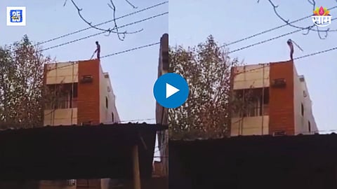Man Jumps Off Roof: सोशल मीडियावर कायम विचित्र आणि धक्कादायक घटनांचे व्हिडिओ समोर येतात.बऱ्याचदा काही तरुणाई स्टंटबाजी करण्याच्या नादात स्वत:चा जीव गमावून बसतात.त्यातच सध्या असाच एक व्हिडिओ सोशल मीडियावर व्हायरल होत आहे.नक्की व्हिडिओ काय घडते ते पाहण्यासाठी संपूर्ण घटनेचा धक्कादायक व्हिडिओ पाहा.