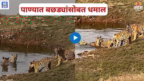 Nagpur Viral Video: नागपूर जिल्ह्यातील उमरेड क-हांडला अभयारण्यात राहणारी प्रसिद्ध F-2 वाघीण सध्या पुन्हा चर्चेत आली आहे. तिचा आणि तिच्या पाच गोंडस बछड्यांचा तलावात पाण्यात मस्ती करतानाचा एक व्हिडिओ सध्या सोशल मीडियावर तुफान व्हायरल होत आहे. उन्हाच्या कडाक्यापासून थोडा आराम मिळवण्यासाठी वाघीण आणि तिचे बछडे तलावात शांतपणे वेळ घालवताना दिसत आहेत. या दृश्याने अनेकांचे मन जिंकले आहेत.
