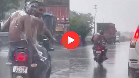आता आणखी एक असाच नवीन व्हिडिओ सध्या सोशल मीडियावर जोरदार व्हायरल होत आहे. यामध्ये दोन तरुण मुसळधार पावसात गाडीवर बसून अंघोळ करताना दिसत आहेत. भर दिवसा शर्ट न घातला साबण लावून रस्त्यावर अंघोळ करताना हे तरुण दिसत आहेत.