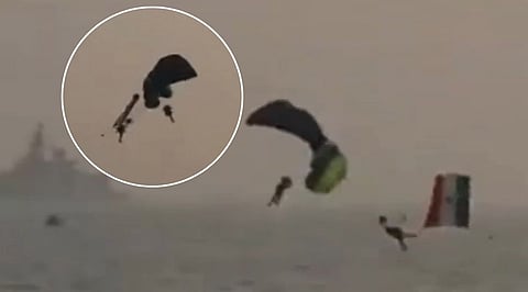 हवेत पॅराशूट उघडल्यानंतर दोन्ही जवानांचे पॅराशूट जवळ आले. पुढे त्यांच्या दोऱ्या एकमेकांमध्ये गुंतल्या. दोऱ्या गुंतल्याने ते हवेतच गोल-गोल गटांगळ्या खाऊ लागले. त्यातील एका जवानाच्या पॅराशूटला तिरंगा जोडलेला होता. हवेतून गटांगळ्या खाऊन नौदलाचे दोन्ही जवान समुद्राच्या पाण्यात पडले. सुदैवाने नौदलाची एक बोट तेथे जवळच होती. त्यानंतर बोटीमधील अधिकाऱ्यांनी त्या दोन्ही जवानांना पाण्यातून बाहेर काढले.